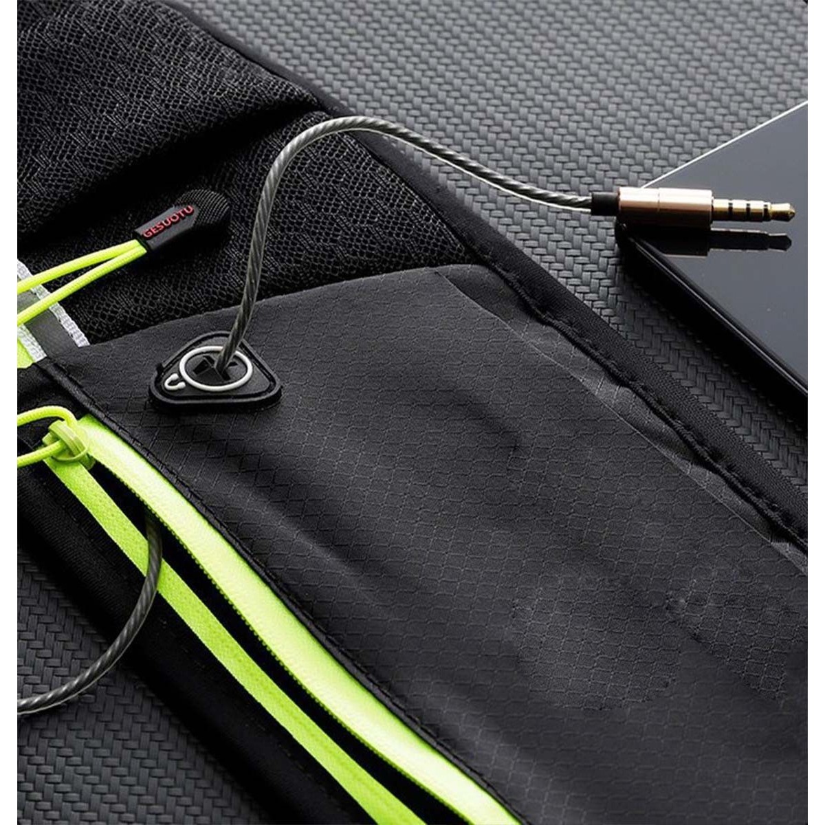 Puede sacar fácilmente los auriculares a través de la abertura de la carcasa. El reproductor de música puede estar dentro de forma segura y puede llevar el cable fácilmente hacia afuera. El tamaño perfecto. Su altura es de 10 cm y el ancho del bolsillo es de 43 cm. La correa se puede ajustar en una escala de 70 a 110 cm. Dimensiones internas del bolsillo principal: 7 cm x 20 cm.