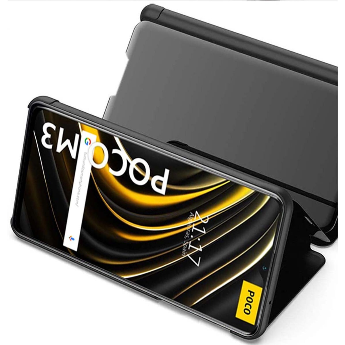 Funda protectora tipo libro y efecto espejo, muy elegante para Xiaomi POCO M3 / Redmi 9T color Negra. Esta funda a parte de su función propia de proteger el movil también se puede usar como soporte ofreciendo la posibilidad de mantener su dispositivo en horizontal para el visionado de peliculas, fotos, videos, etc.