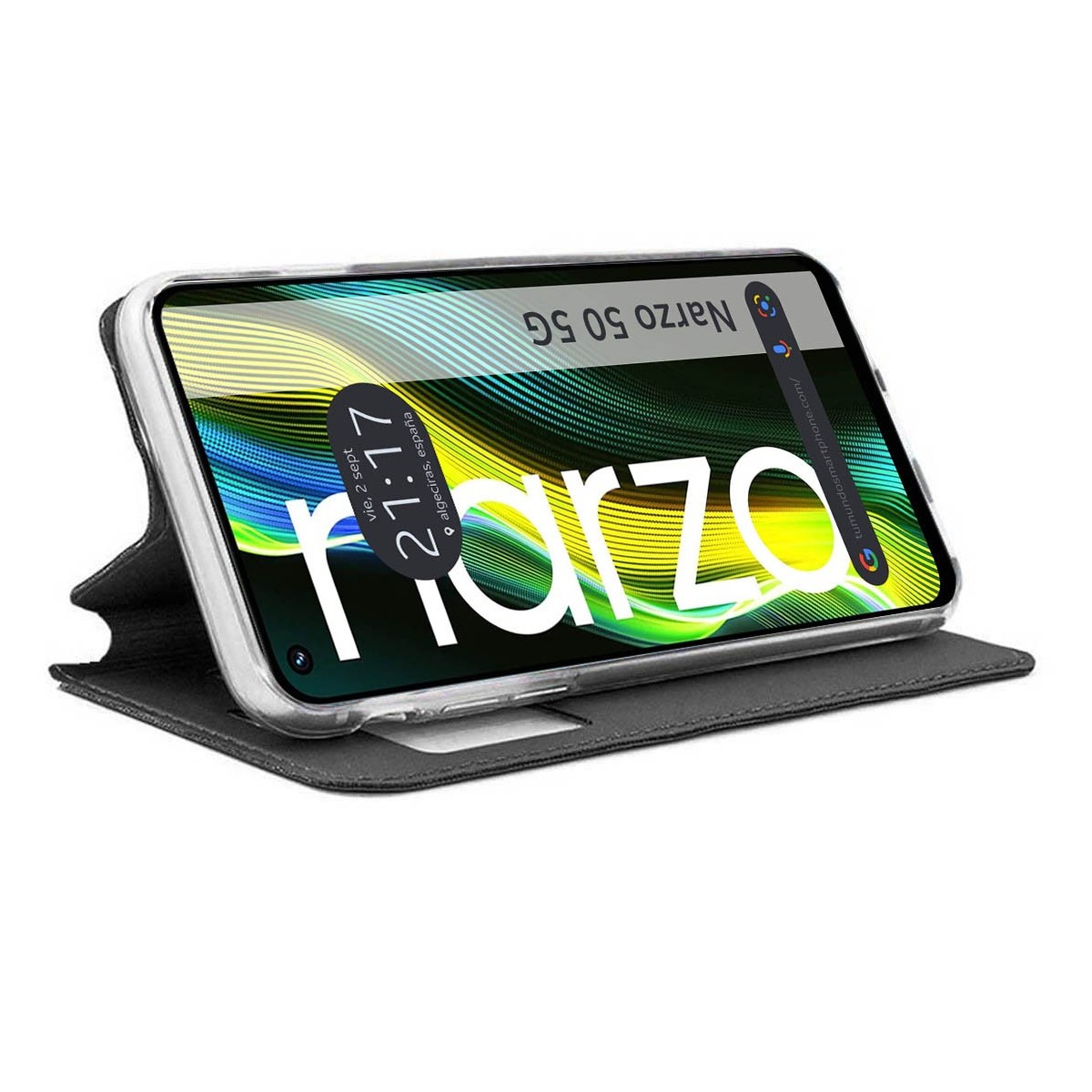 Funda Flip Cover Soporte con ventana, de apertura lateral tipo libro, color Negra para Realme Narzo 50 5G.