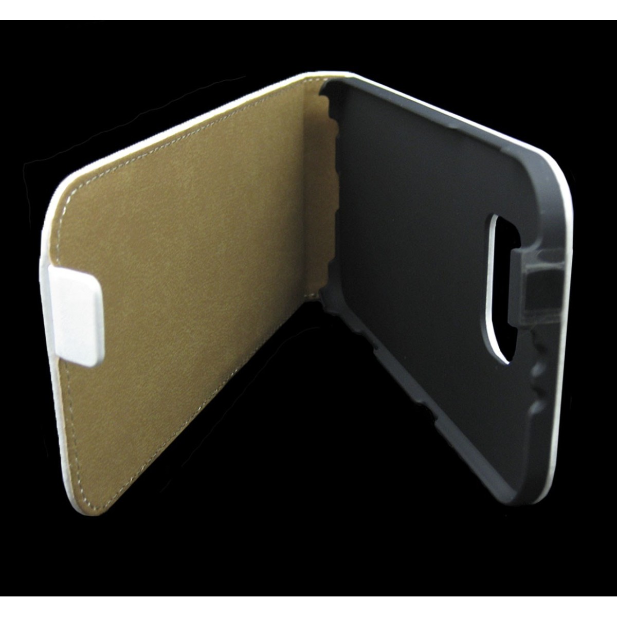 En su interior esta forrada con una tela aterciopelada en color camel que proteje la pantalla del movil cuando la tapa está cerrada. Posee en el interior un molde de policarbonato en el cual encaja a la perfección el terminal, ya que está diseñado exclusivamente para él y se adapta perfectamente al movil sin interrumpir ninguna función ni botón (altavoz, microfono, botones, etc).