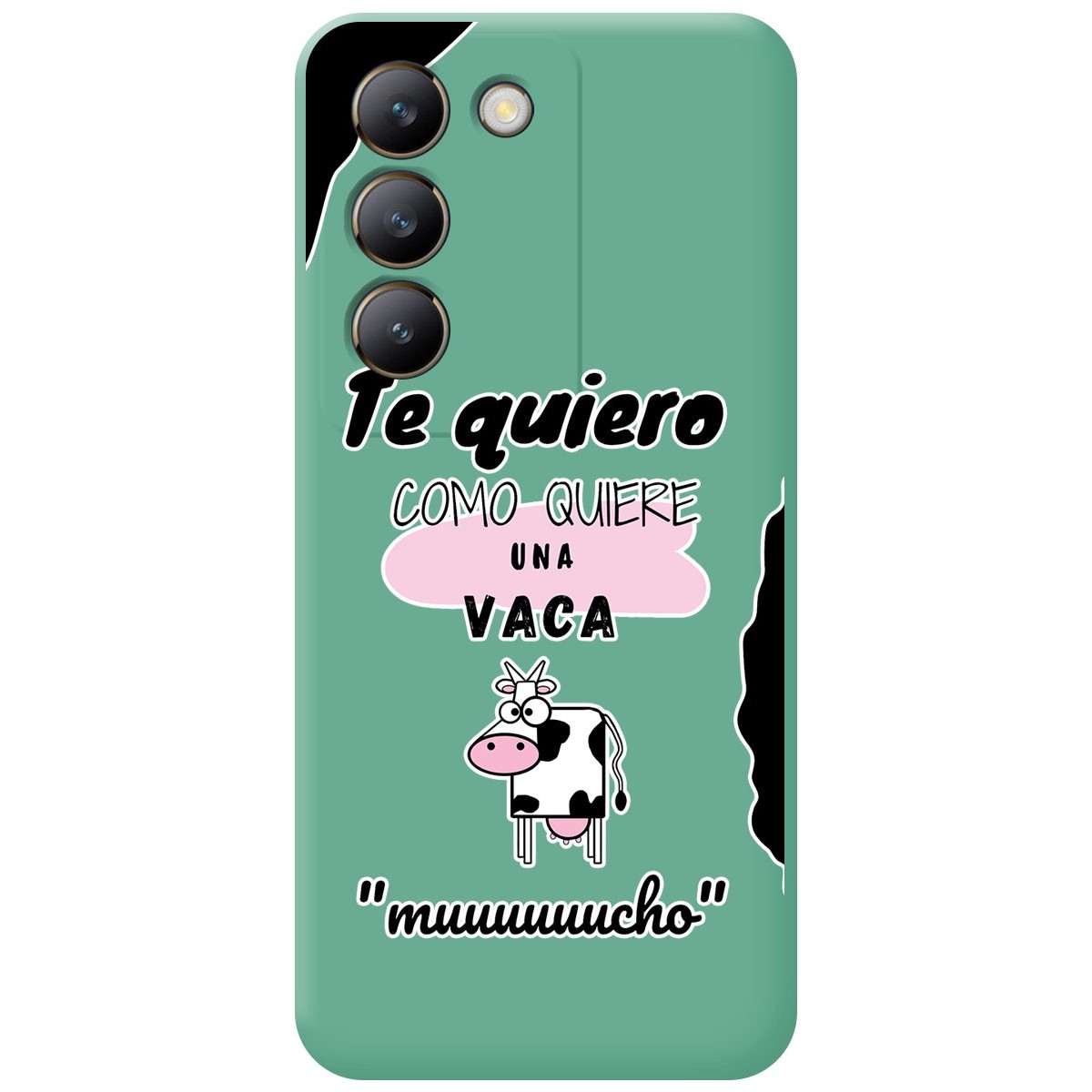 Funda Carcasa de Silicona Líquida color Verde personalizada dibujo Vaca para Vivo V40 SE 5G. Esta funda posee un buen equilibrio y está formada por dos capas una interior que le proporciona rigidez y otra exterior que le da un acabado suave y sedoso. La parte interior de esta funda está formada por una tela aterciopelada que evita los arañazos de su móvil.