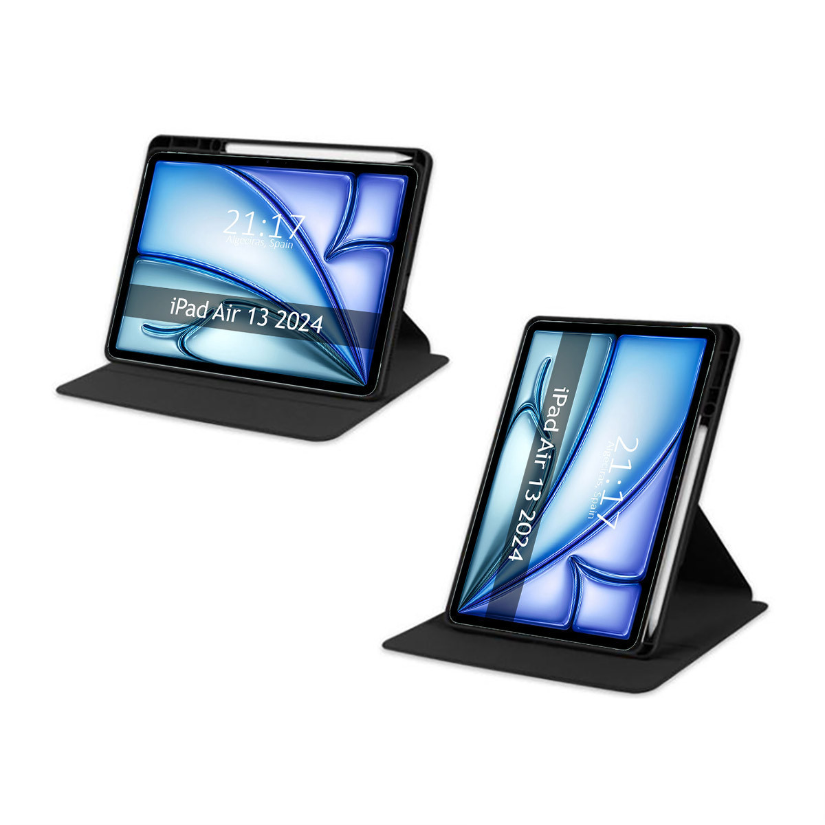Funda Giratoria 360º con tapa Smart para Apple iPad Air 2024 13 (M2) en color Negra. Esta funda se distingue por una delicada imitación de piel con una funda interior acrílica transparente, de gran calidad. Lo que hace que esta funda ofrezca una gran seguridad, además de una gran elegancia.