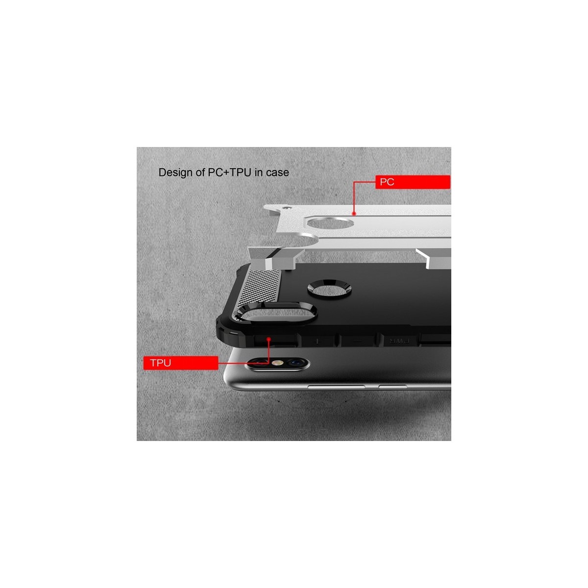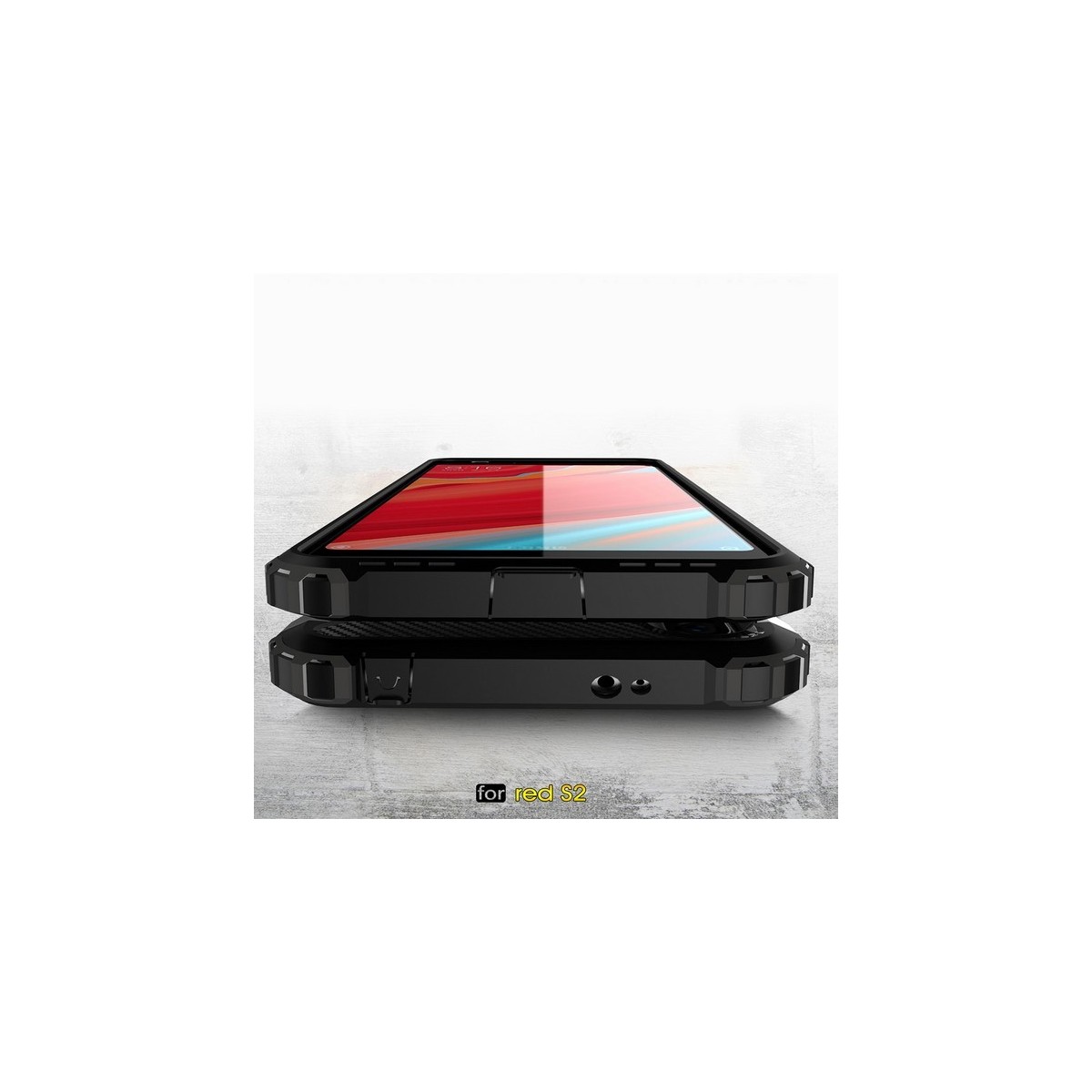 Funda Protectora Negra de robusto diseño que combina 2 partes una de gel TPU que envuelve el teléfono y otra de policarbonato que le dá rigidez a la funda para Xiaomi Redmi S2.