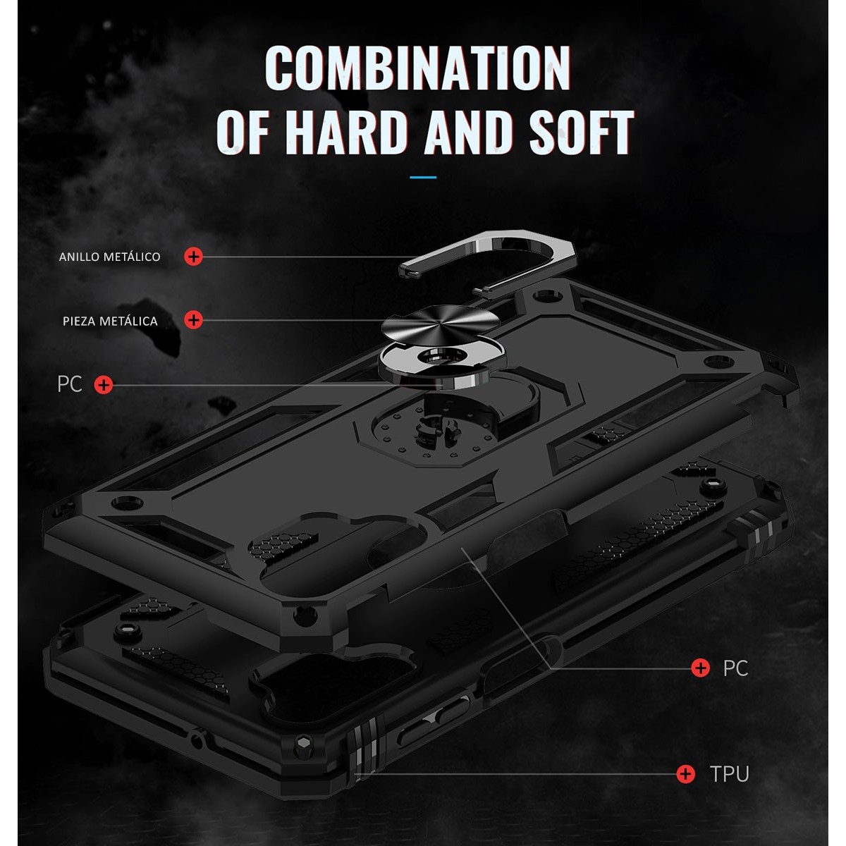 Funda Protectora con anillo integrado de robusto diseño que combina 2 partes una de gel TPU que envuelve el teléfono y otra de policarbonato que le dá rigidez a la funda para Samsung Galaxy A13 4G.