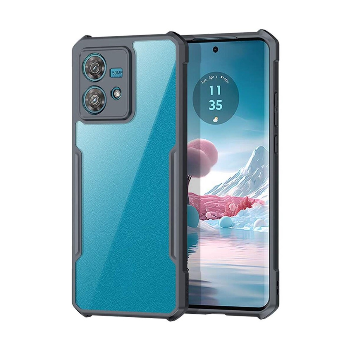 Funda Protectora de policarbonato transparente con borde de silicona negro para Motorola Edge 40 Neo 5G, diseñada para proporcionar la máxima protección al dispositivo manteniendo parcialmente su estética original.