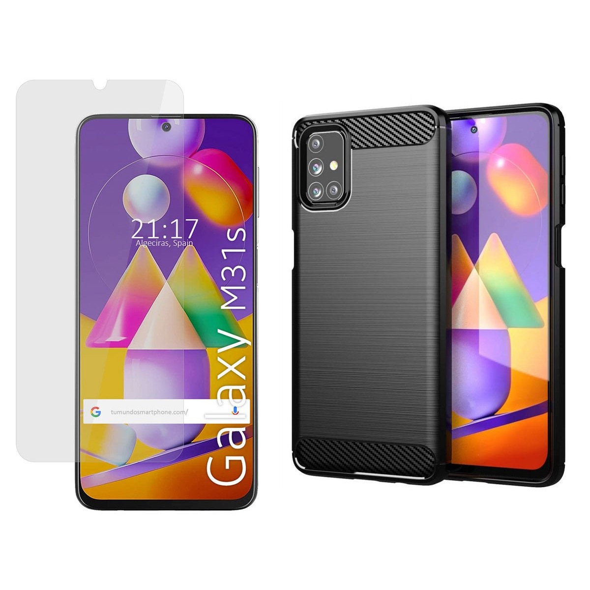 Pack 2 en 1 compuesto por Funda de Gel TPU negra modelo Carbón y Protector de pantalla transparente de vidrio templado de 0,3 mm para Samsung Galaxy M31s.