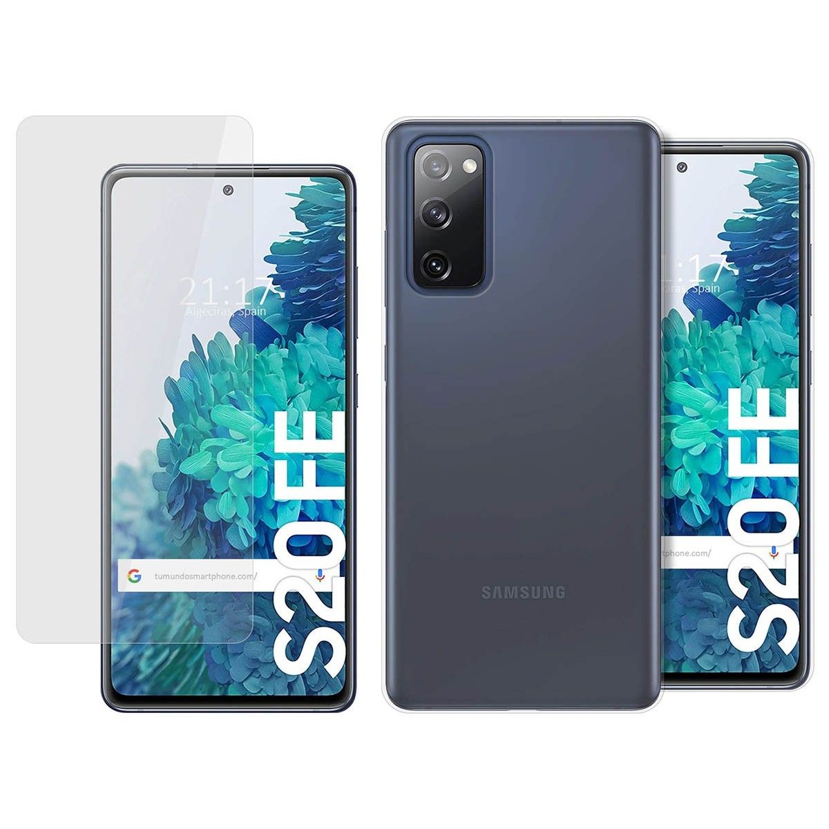 Pack 2 en 1 compuesto por Funda de Silicona Gel TPU 100% Transparente y Protector de pantalla transparente de vidrio templado de 0,3 mm para Samsung Galaxy S20 FE.