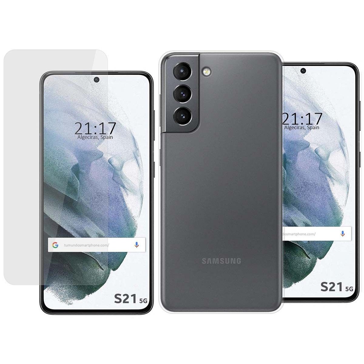 Pack 2 en 1 compuesto por Funda de Silicona Gel TPU 100% Transparente y Protector de pantalla transparente de vidrio templado de 0,3 mm para Samsung Galaxy S21 5G.