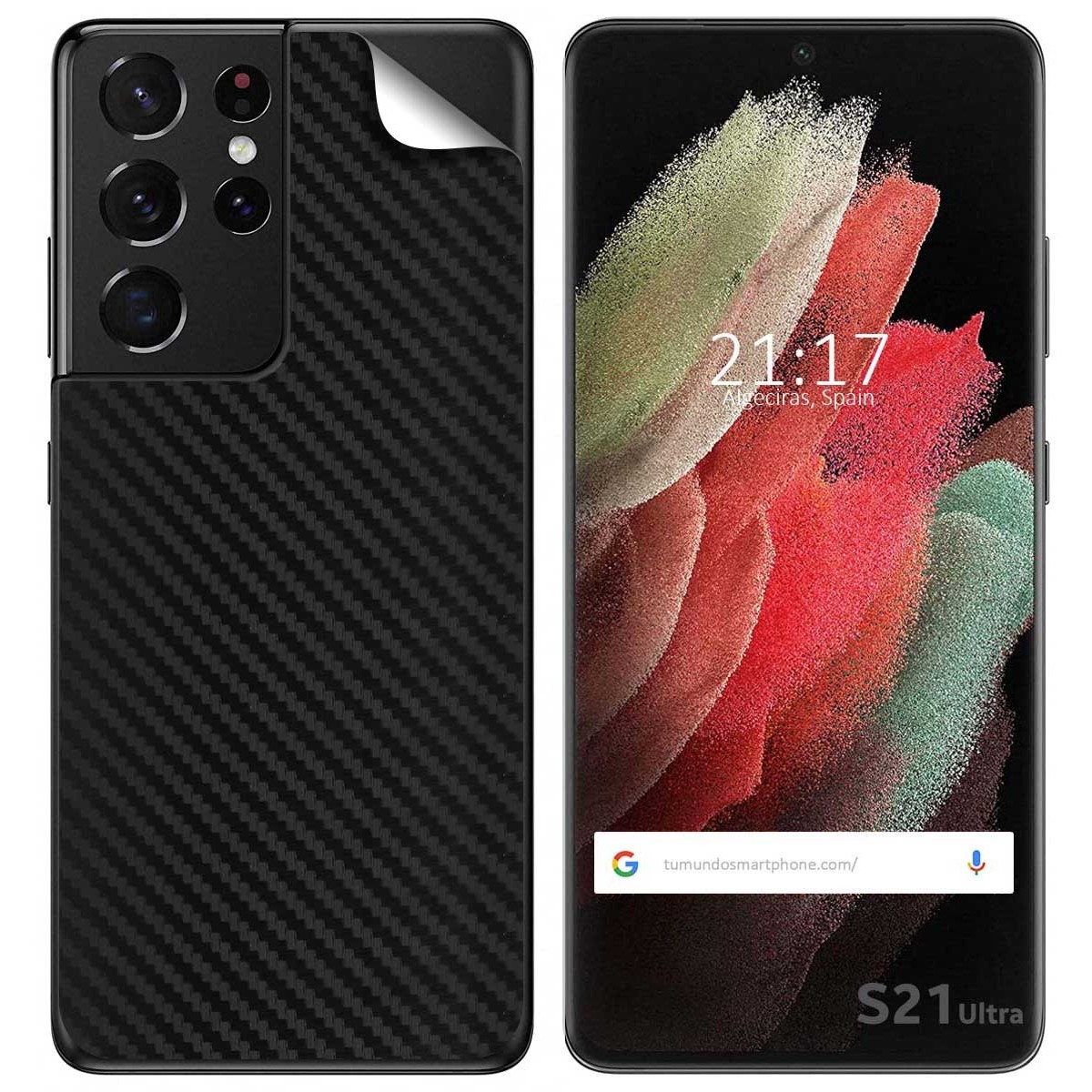 Decora la parte trasera de tu smartphone con esta pegatina de vinilo autoadhesiva con textura Carbono. Diseñado para adaptarse a tu Samsung Galaxy S21 Ultra 5G, como se muestra en la imagen. No cubre los laterales, solo la parte trasera de tu teléfono.