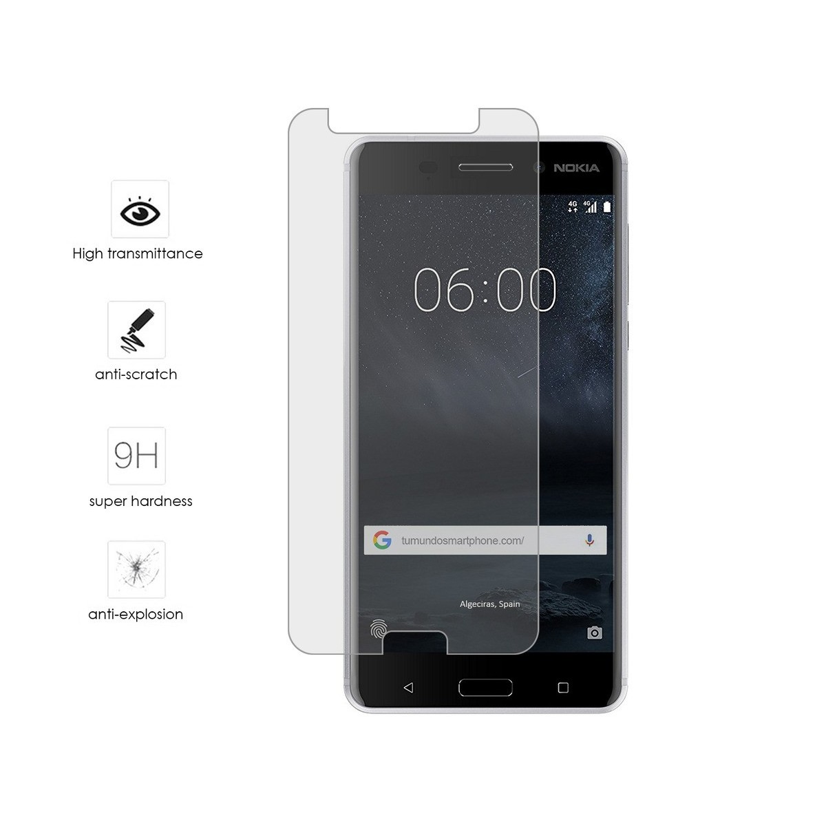 Protector de pantalla transparente para Nokia 6 , fabricado con vidrio templado de 0,3 mm, especialmente reforzado durante el procesado, diseñado y construido para resistir cualquier daño y los rasguños externos.